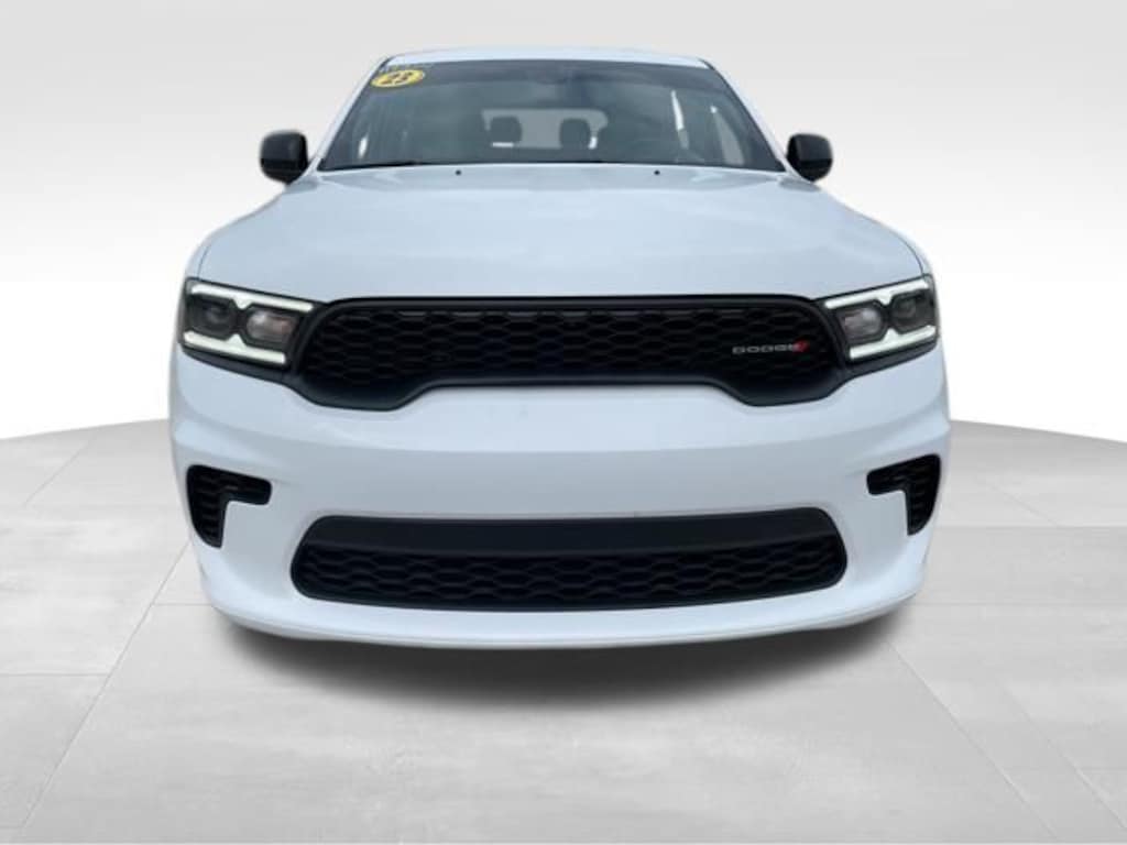 ONE OWNER, BLUETOOTH, USB & AUX PORT, USB-C PORT, USB PORT, BACK UP CAMERA, REAR BACK UP SENSORS, HEATED SEATS, HEATED STEERING WHEEL, THIRD ROW SEATING, BLUETOOTH AUDIO, REAR CROSS TRAFFIC ALERT, BLIND SPOT MONITOR, POWER LIFTGATE, STEERING WHEEL PADDLE SHIFTERS, UCONNECT, ANDROID AUTO, APPLE CAR PLAY, XM RADIO CAPABLE, ECO BUTTON, SPORT BUTTON, KEYLESS ENTRY, PUSH BUTTON START, DRIVER'S POWERED SEAT, REMOTE START, REAR PARKSENSE BRAKE ASSIST, AWD, 3.45 Rear Axle Ratio, 3rd row seats: split-bench, 4-Wheel Disc Brakes, 6 Speakers, ABS brakes, AM/FM radio: SiriusXM, Apple CarPlay/Android Auto, Auto-dimming Rear-View mirror, Automatic temperature control, Brake assist, Bumpers: body-color, Cloth Bucket Seats w/Shift Insert, Compass, Delay-off headlights, Driver door bin, Driver vanity mirror, Dual front impact airbags, Dual front side impact airbags, Electronic Stability Control, Exterior Mirrors w/Heating Element, Four wheel independent suspension, Front anti-roll bar, Front Bucket Seats, Front Center Armrest w/Storage, Front dual zone A/C, Front reading lights, Fully automatic headlights, Garage door transmitter, Gloss Black Exterior Mirrors, GPS Antenna Input, Heated door mirrors, Heated front seats, Heated steering wheel, Illuminated entry, Integrated Center Stack Radio, Integrated Voice Command w/Bluetooth, Knee airbag, Leather steering wheel, Low tire pressure warning, Occupant sensing airbag, Outside temperature display, Overhead airbag, Overhead console, Panic alarm, ParkView Rear Back-Up Camera, Passenger door bin, Passenger vanity mirror, Power door mirrors, Power driver seat, Power Liftgate, Power steering, Power windows, Quick Order Package 2BD GT, Radio data system, Radio: Uconnect 4 w/8.4" Display, Rear air conditioning, Rear anti-roll bar, Rear reading lights, Rear seat center armrest, Rear window defroster, Rear window wiper, Red Accent Stitching, Remote keyless entry, Speed control, Speed-sensing steering, Speed-Sensitive Wipers, Split folding rear seat, Spoiler, Sport steering wheel, Steering wheel mounted audio controls, Tachometer, Telescoping steering wheel, Tilt steering wheel, Traction control, Trip computer, USB Host Flip, Variably intermittent wipers, Wheels: 20" x 8.0" Fine Silver. White Knuckle Clearcoat 2023 Dodge Durango GT AWD 8-Speed Automatic 3.6L V6 24V VVT