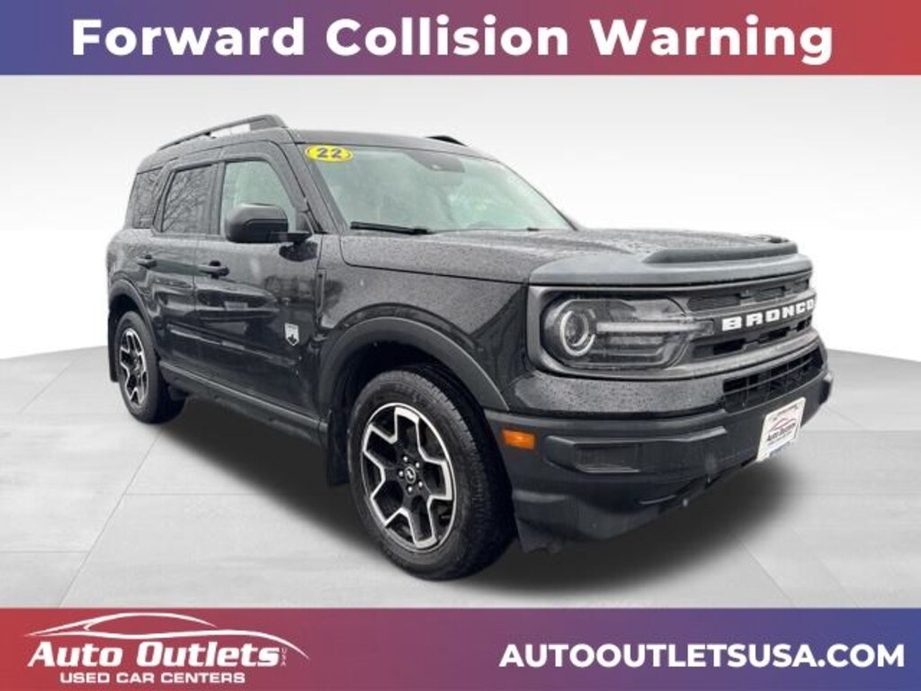 BLUETOOTH, USB-C PORT, USB PORT, BACK UP CAMERA, REAR BACK UP SENSORS, BLUETOOTH AUDIO, WIFI CAPABLE, LANE ASSIST, REAR CROSS TRAFFIC ALERT, FORWARD COLLISION WARNING, BLIND SPOT MONITOR, ANDROID AUTO, APPLE CAR PLAY, XM RADIO CAPABLE, 911 ASSIST, ECO BUTTON, SPORT BUTTON, PUSH BUTTON START, TOUCH SCREEN DISPLAY, 6 Speakers, AM/FM radio: SiriusXM, AM/FM Stereo, Auto High-beam Headlights, Brake assist, Delay-off headlights, Electronic Stability Control, Equipment Group 200A, Front reading lights, Fully automatic headlights, Illuminated entry, Outside temperature display, Radio data system, SiriusXM Radio, SYNC 3 Communications & Entertainment System, SYNC 3/Apple CarPlay/Android Auto. Shadow Black 2022 Ford Bronco Sport Big Bend 25/28 City/Highway MPG 4D Sport Utility 4WD 8-Speed Automatic 1.5L EcoBoost