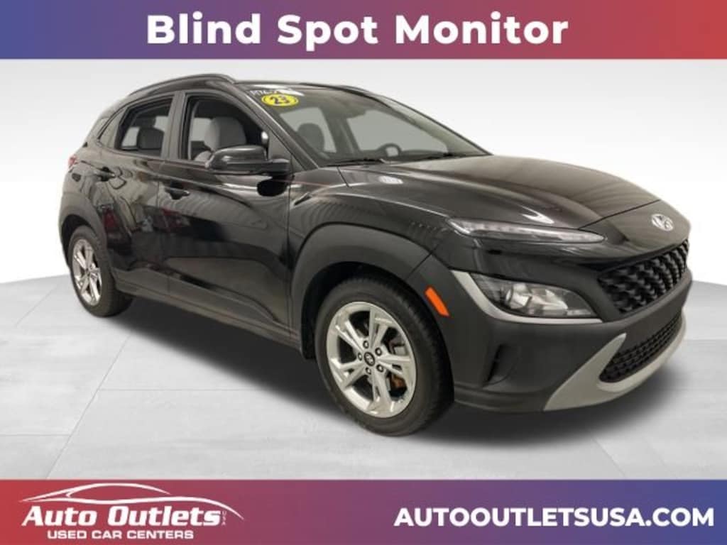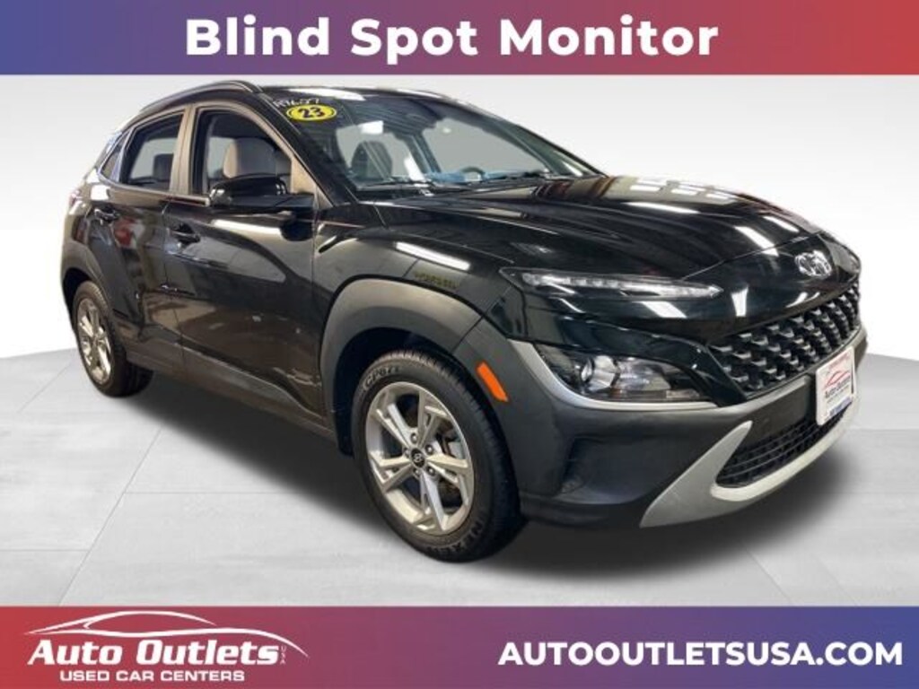 ONE OWNER, BLUETOOTH, USB PORT, BACK UP CAMERA, BLUETOOTH AUDIO, WIFI CAPABLE, REAR CROSS TRAFFIC ALERT, LANE ASSIST, FORWARD COLLISION WARNING, BLIND SPOT MONITOR, ANDROID AUTO, APPLE CAR PLAY, XM RADIO CAPABLE, SPORT BUTTON, AUTO STOP/START TECHNOLOGY, KEYLESS ENTRY, PUSH BUTTON START, TOUCH SCREEN DISPLAY, DRIVER'S POWERED SEAT, LANE KEEPING ASSIST, SAFE EXIT ASSIST, DRIVER ATTENTION WARNING, BLUELINK, 17" x 7.0J Alloy Wheels, 4-Wheel Disc Brakes, 6 Speakers, ABS brakes, Air Conditioning, Apple CarPlay & Android Auto, Brake assist, Bumpers: body-color, Cargo Net, Cloth Seat Trim, Delay-off headlights, Driver door bin, Driver vanity mirror, Dual front impact airbags, Dual front side impact airbags, Electronic Stability Control, Emergency communication system: Blue Link Connected Car Service (3-year complimentary subscription), Exterior Parking Camera Rear, Four wheel independent suspension, Front anti-roll bar, Front Bucket Seats, Front Center Armrest, Front reading lights, Fully automatic headlights, Heated door mirrors, Illuminated entry, Low tire pressure warning, Occupant sensing airbag, Option Group 01, Outside temperature display, Overhead airbag, Overhead console, Panic alarm, Passenger door bin, Passenger vanity mirror, Power door mirrors, Power driver seat, Power steering, Power windows, Radio: AM/FM/HD/SiriusXM Audio System, Rear anti-roll bar, Rear seat center armrest, Rear window defroster, Rear window wiper, Remote keyless entry, Security system, Speed control, Speed-sensing steering, Split folding rear seat, Spoiler, Steering wheel mounted audio controls, Tachometer, Telescoping steering wheel, Tilt steering wheel, Traction control, Trip computer, Turn signal indicator mirrors, Variably intermittent wipers. Ultra Black Pearl 2023 Hyundai Kona SEL AWD CVT 2.0L I4 DOHC Dual CVVT