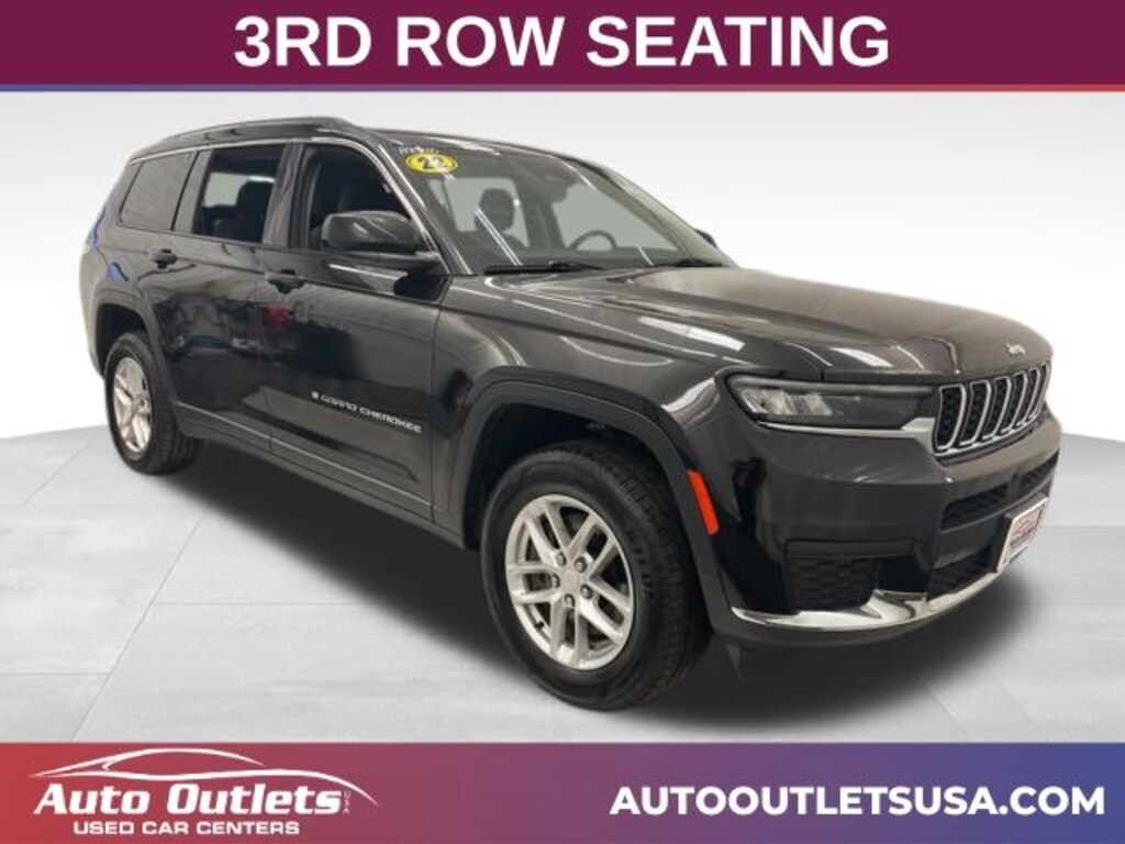 ONE OWNER, BLUETOOTH, USB & AUX PORT, USB-C PORT, USB PORT, BACK UP CAMERA, REAR BACK UP SENSORS, HEATED SEATS, HEATED STEERING WHEEL, THIRD ROW SEATING, BLUETOOTH AUDIO, WIFI CAPABLE, POWER OUTLET, ADAPTIVE CRUISE CONTROL, REAR CROSS TRAFFIC ALERT, LANE ASSIST, FORWARD COLLISION WARNING, BLIND SPOT MONITOR, POWER LIFTGATE, XM RADIO CAPABLE, 911 ASSIST, SPORT BUTTON, AUTO STOP/START TECHNOLOGY, KEYLESS ENTRY, PUSH BUTTON START, TOUCH SCREEN DISPLAY, DRIVER'S POWERED SEAT, REMOTE START, ACTIVE LANE MANAGEMENT, PEDESTRIAN DETECTION, LANE KEEP ASSIST, STEERING ASSIST, 115V Auxiliary Power Outlet, 3.45 Rear Axle Ratio, 3rd Row Charge-Only USB Ports, 3rd row seats: split-bench, 4-Wheel Disc Brakes, 6 Speakers, ABS brakes, Active Cruise Control, AM/FM radio, Anti-whiplash front head restraints, Automatic temperature control, Brake assist, Bumpers: body-color, Cloth Seats, Compass, Delay-off headlights, Driver door bin, Driver vanity mirror, Dual front impact airbags, Dual front side impact airbags, Electronic Stability Control, Emergency communication system, Four wheel independent suspension, Front anti-roll bar, Front Bucket Seats, Front Center Armrest w/Storage, Front dual zone A/C, Front reading lights, Fully automatic headlights, Heated door mirrors, Heated Front Seats, Heated Steering Wheel, Illuminated entry, Knee airbag, Leather Wrapped Steering Wheel, Low tire pressure warning, Luxury Tech Group I, Manual Fold Seatbacks, Normal Duty Suspension, Occupant sensing airbag, Outside temperature display, Overhead airbag, Overhead console, Panic alarm, ParkView Rear Back-Up Camera, Passenger door bin, Passenger vanity mirror, Power door mirrors, Power driver seat, Power Liftgate, Power steering, Power windows, Quick Order Package 22A, Radio data system, Radio: Uconnect 5 w/8.4" Display, Rain Sensitive Windshield Wipers, Rear air conditioning, Rear anti-roll bar, Rear reading lights, Rear window defroster, Rear window wiper, Reclining 3rd row seat, Remote keyless entry, Remote Start System, Security system, Selectable Tire Fill Alert, Speed-Sensitive Wipers, Split folding rear seat, Spoiler, Steering wheel mounted audio controls, Tachometer, Telescoping steering wheel, Tilt steering wheel, Traction control, Trip computer, Variably intermittent wipers, Wheels: 18" x 8.0" Fully Painted Aluminum, Wireless Charging Pad. Diamond Black Crystal Pearlcoat 2022 Jeep Grand Cherokee L Laredo 4WD 8-Speed Automatic 3.6L V6 24V VVT